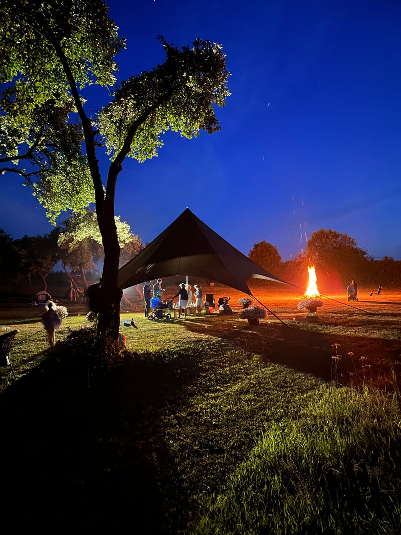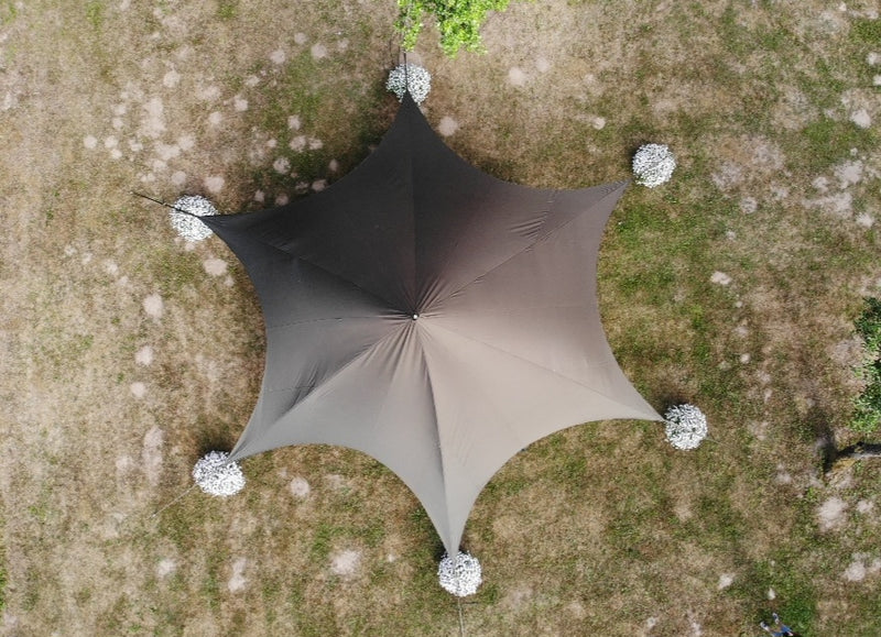Olīvzaļa 50 m² zvaigznes telts – pasākumu piemēri
